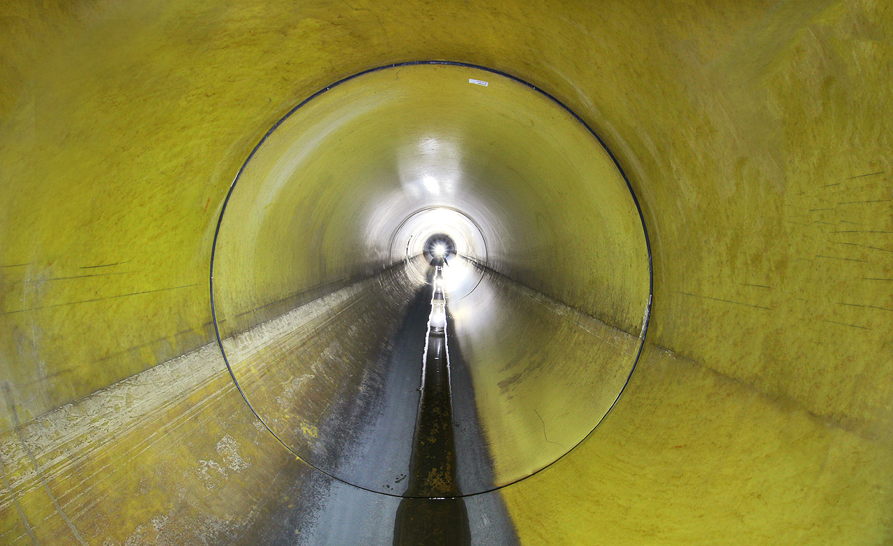 | | Vnitřní povrch rour je tvořen hladkou vrstvou sklolaminátu, která je na pohled hezká, ve skutečnosti však sterilně nudná. V předklonu (nebo vleže na skatu) lze jen mírně se zužující rourou putovat přes 2 km. |