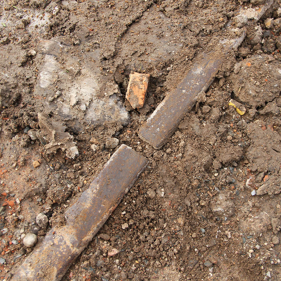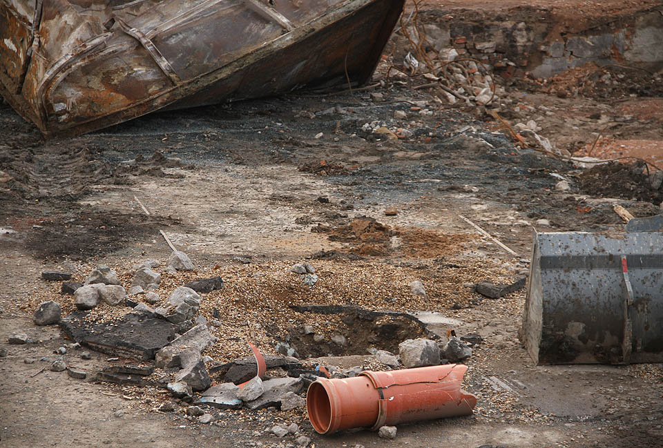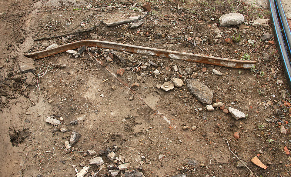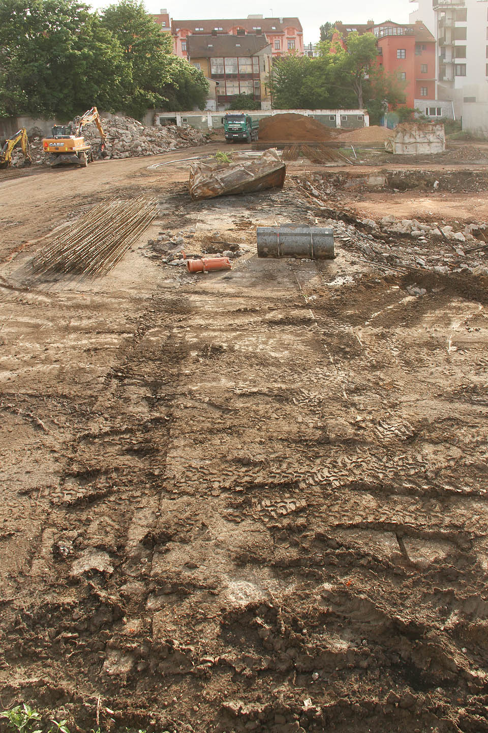 | | Celkový pohled na staveniště na místě někdejší továrny Tusculum ze Střední ulice. Východní koleje jsou dobře rozpoznatelné v levé dolní části snímku (jižnější již částečně vytrhaná, severnější prochází pod odloženou radlicí buldozeru). Pod koly zeleného nákladnícho auta začínají západní koleje, které vedou doprava k betonové zdi v zadním traktu nového domu. |