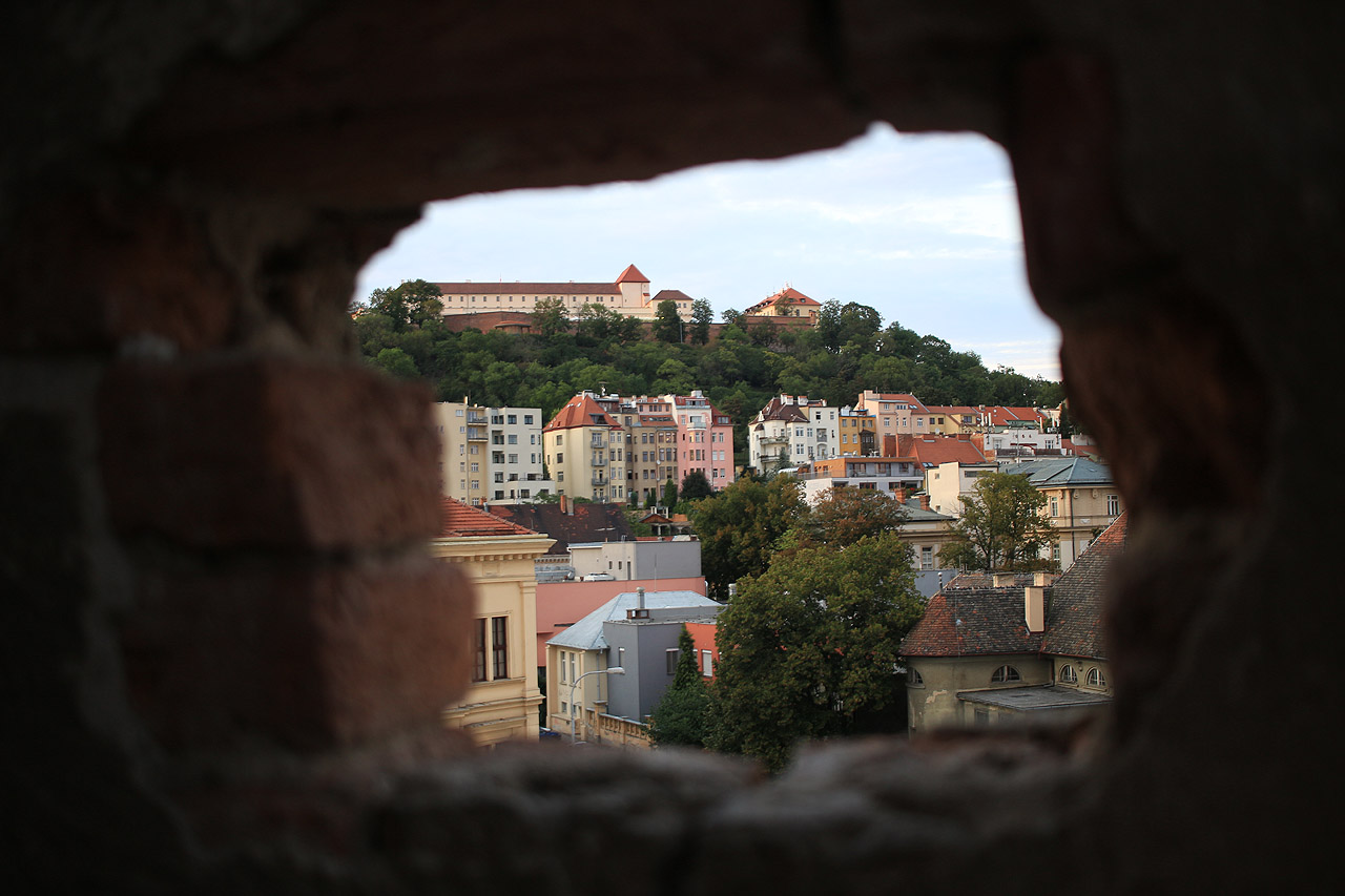 Výhled na Staré brno skrze rozpáraný vikýř. Poslední pavlačové domy se střídavým úspěchem odolávají naneštěstí obvykle nenápaditým moderním stavbám. Dožijí se alespoň některé i dalšího století?
