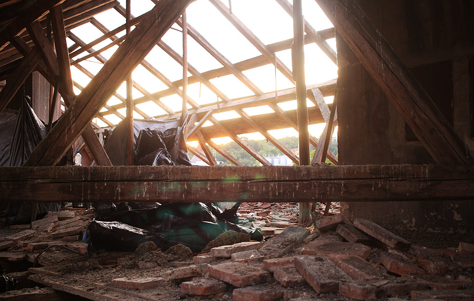 Demolice střechy probíhá na sklonku léta 2019 citlivým způsobem, s ukládáním odstraněného materiálu do černých plastových vaků.