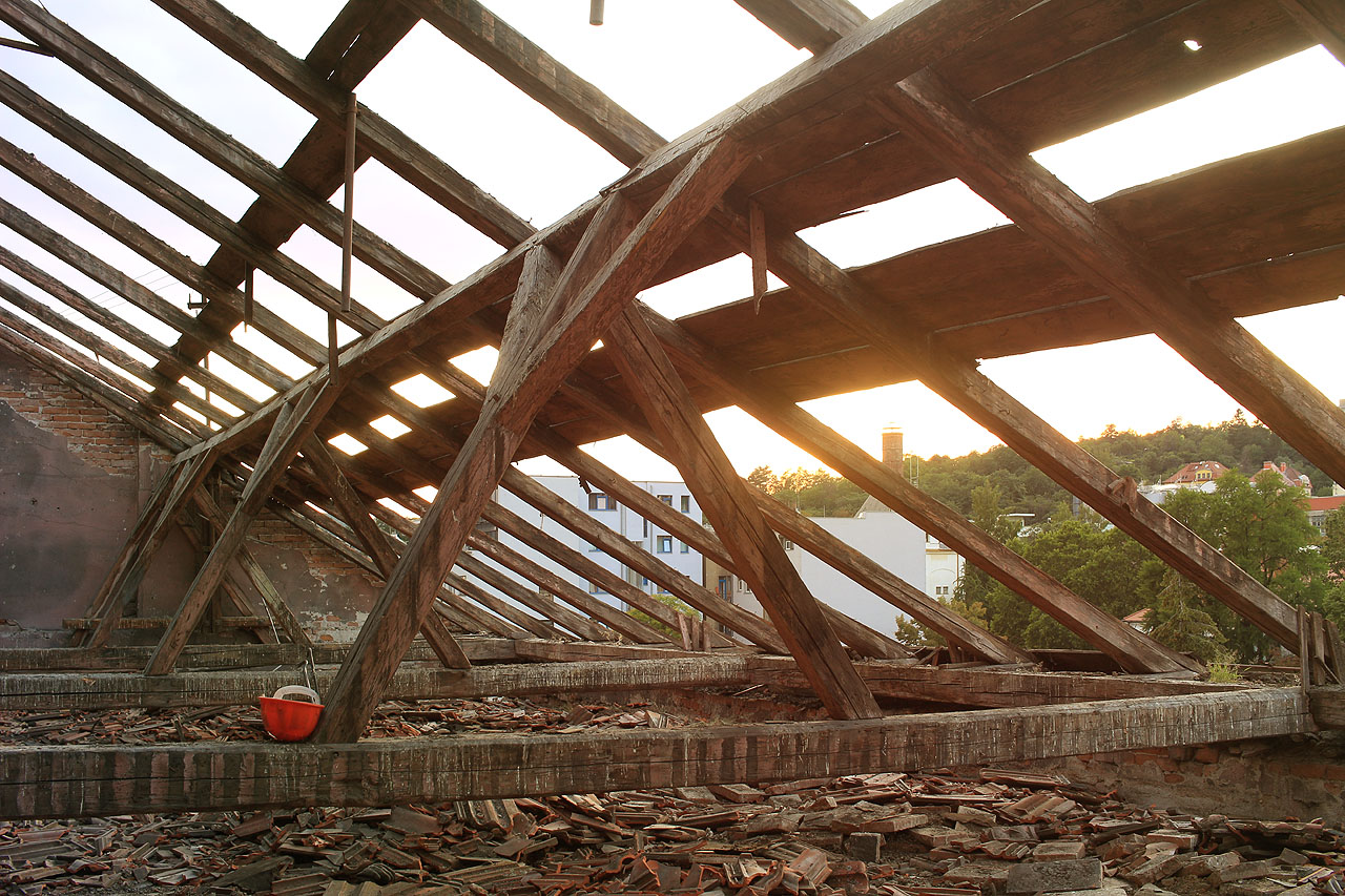 Odhalené krovy připomínají ohlodanou velrybí kostru, skrze níž je vidět nebe nad Brnem.