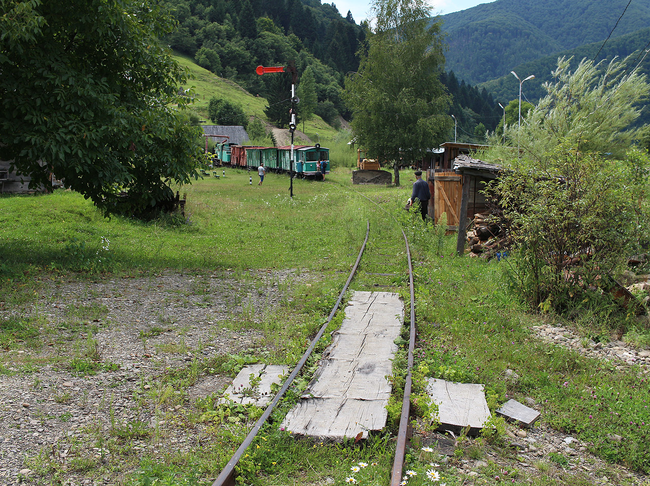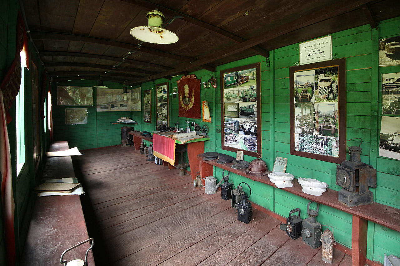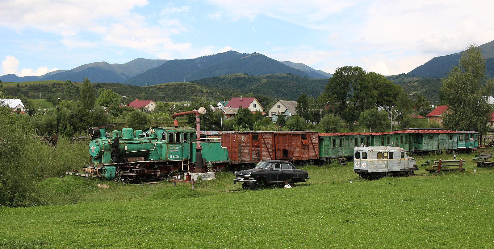 Na úzkorozchodce se nachází vozidla z několika zakarpatských tratí sovětské, mašdarské a československé provenience (díky kompatibilitě bosenského rozchodu 760 mm, používaného v dobách Československa, se sovětským rozchodem 750 mm jsou všechny exponáty na stejné koleji). Zřejmě nejzajímavějším strojem je parní lokomotiva z lokomotivky Karla Marxe (dříve Orenstein & Koppel) v německém Babelsberg z roku 1951, převezená sem původně z Chmilniku na Boržavské úzkorozchodce, kde chátrala od roku 1973; motorová drezína z osobní Volhy GAZ-21 nebo sanitní drezína СМД-1.