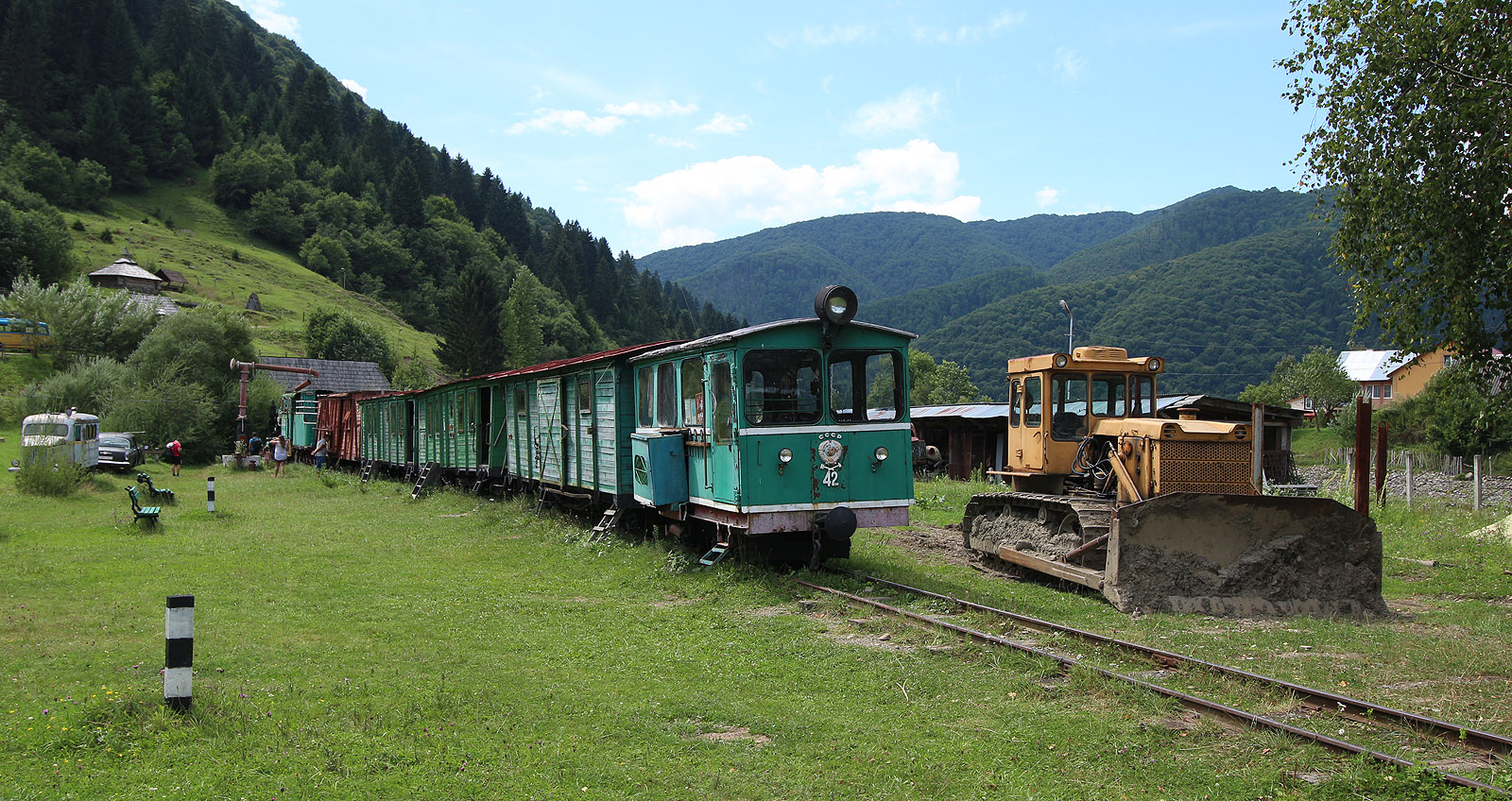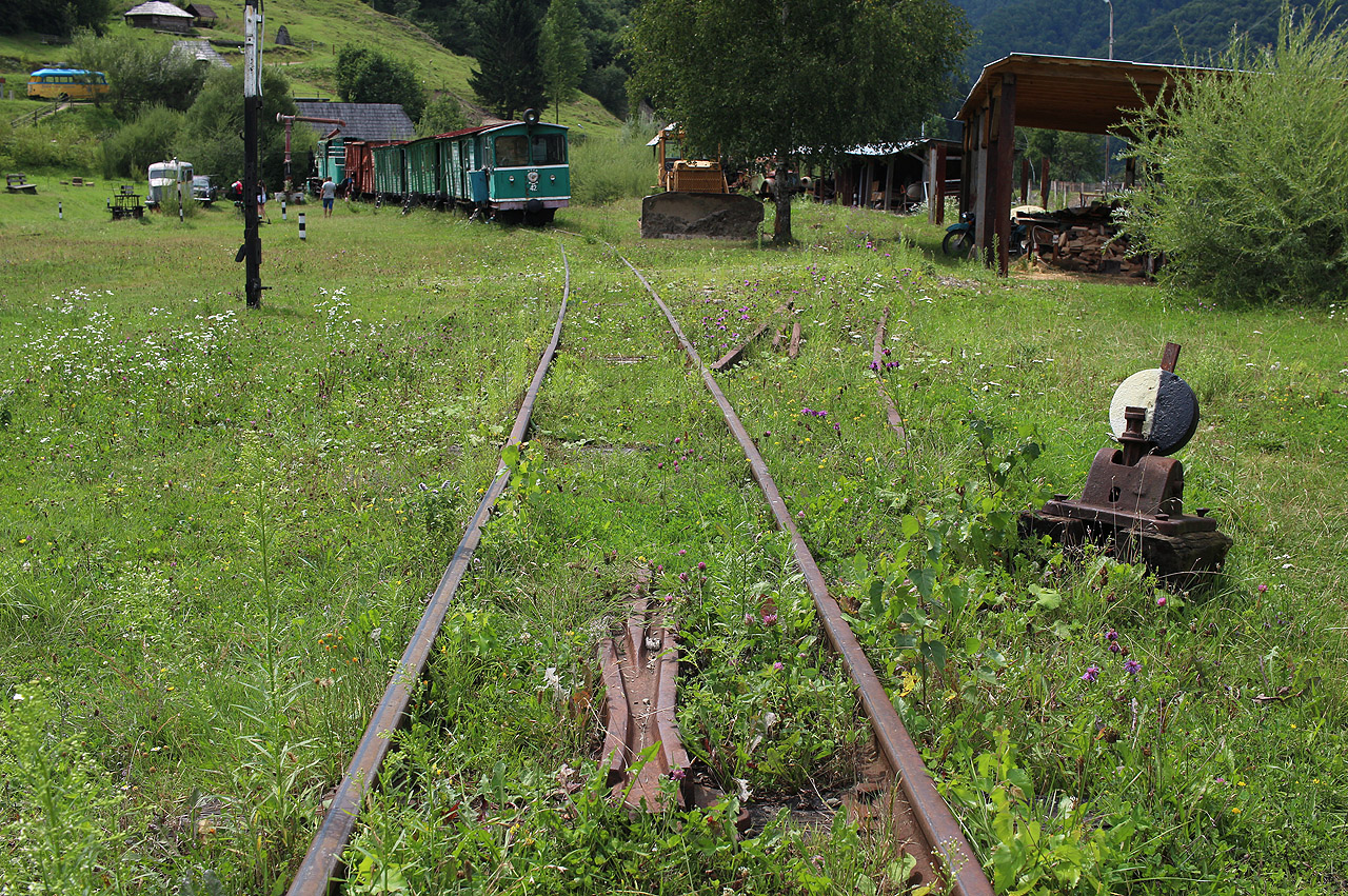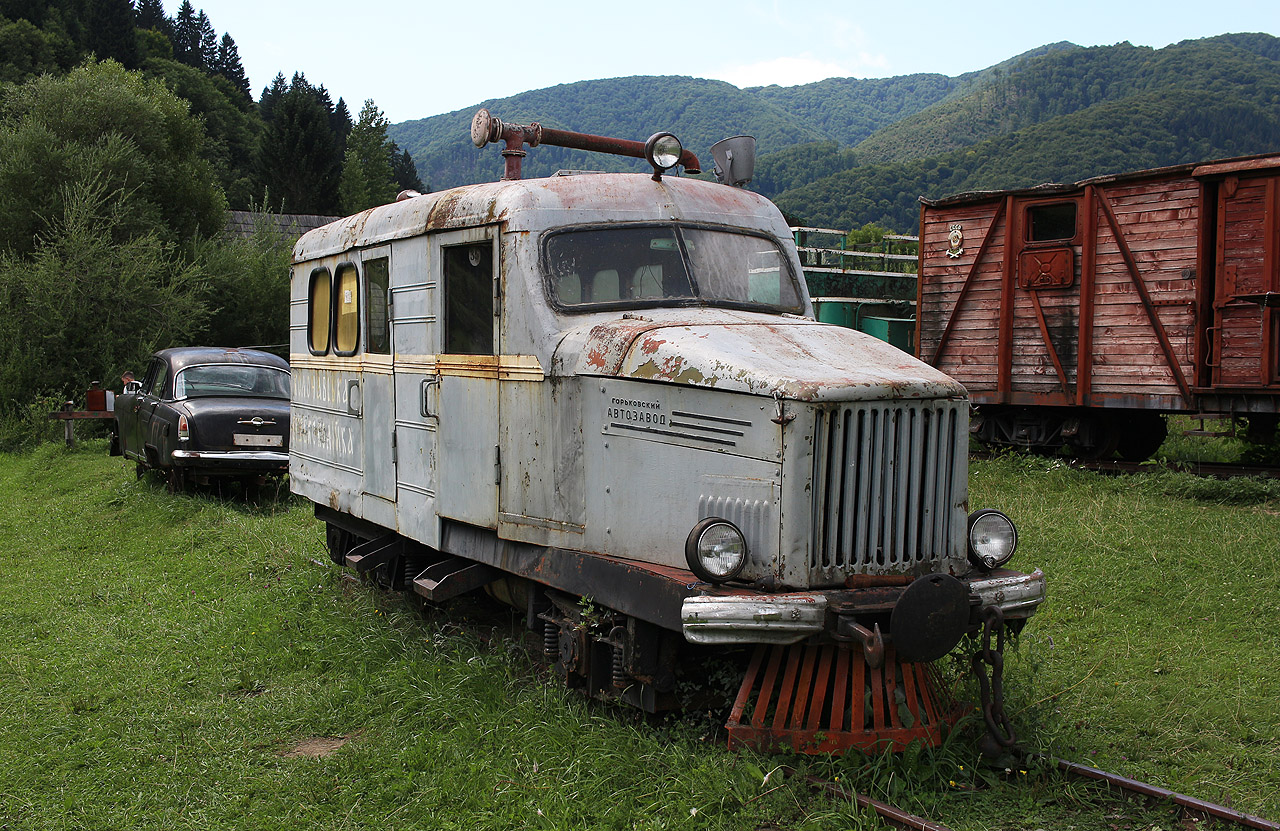 Na úzkorozchodce se nachází vozidla z několika zakarpatských tratí sovětské, mašdarské a československé provenience (díky kompatibilitě bosenského rozchodu 760 mm, používaného v dobách Československa, se sovětským rozchodem 750 mm jsou všechny exponáty na stejné koleji). Zřejmě nejzajímavějším strojem je parní lokomotiva z lokomotivky Karla Marxe (dříve Orenstein & Koppel) v německém Babelsberg z roku 1951, převezená sem původně z Chmilniku na Boržavské úzkorozchodce, kde chátrala od roku 1973; motorová drezína z osobní Volhy GAZ-21 nebo sanitní drezína СМД-1.