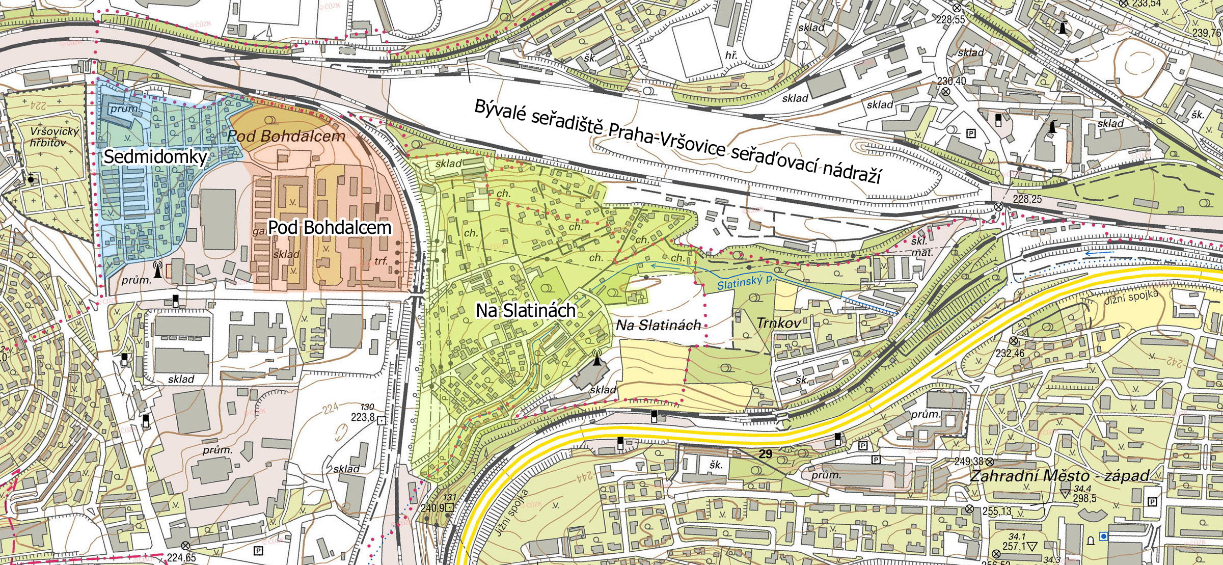 |  | | Za jednokolejnou železniční spojkou z roku 1998 se rozkládá kolonie Na Slatinách. |