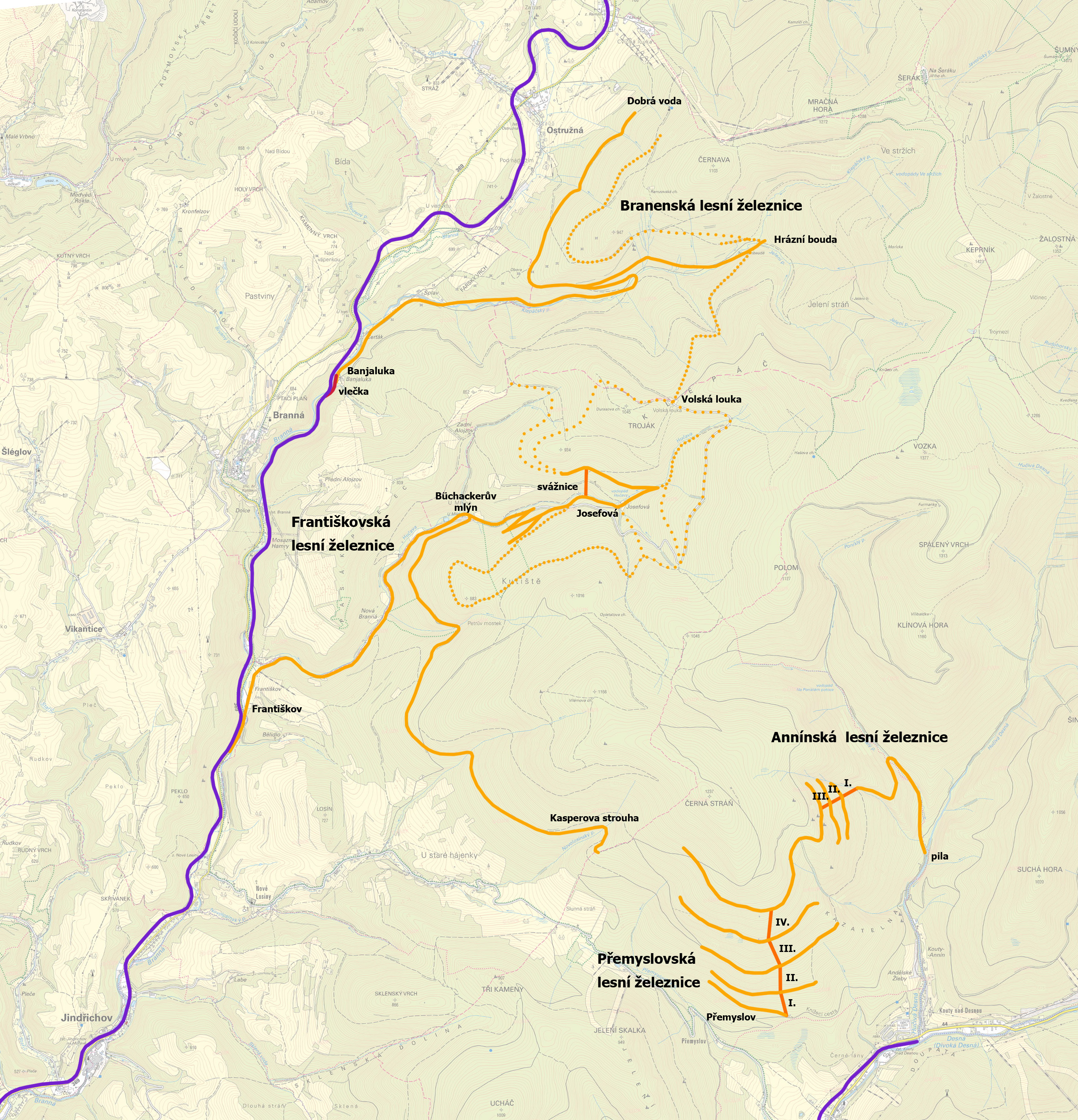 Jihozápadní ze čtyř lichtenštejnských lesních drážek v Jeseníkách začínala v údolí říčky Branné u rampy státní dráhy ve Františkově (jižně od Branné). Drážka o rozchodu 700 mm pokračovala necelých 6 km proti proudu potoka do osady Josefová, kde na ni navazovala svážnice pro zdvíhání vozíků a dalších asi 1000 m kolejí výše na planině pod vrcholem kopce Trojáku.