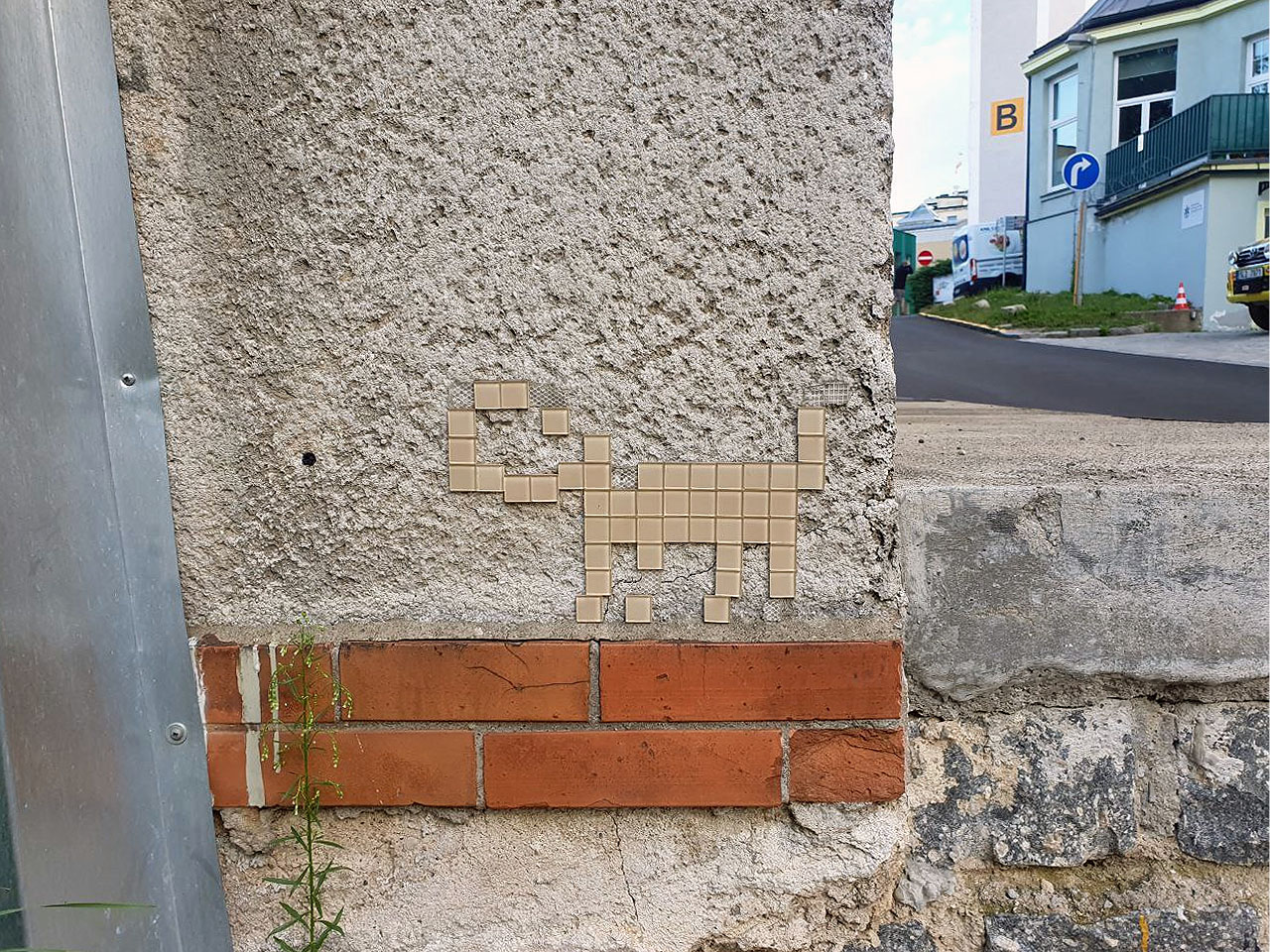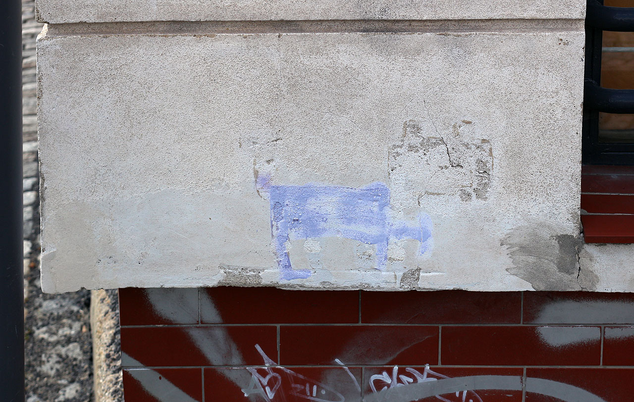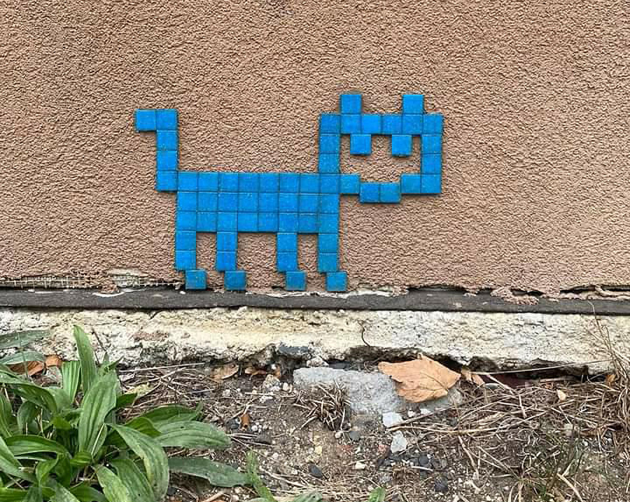 | Kočka s rouškou u nádraží | Modrá kočka má dvě kachličky na hlavě bílé jako roušku. Kočka prodlévá na chátrajícím paláci firmy Skloexport a zřejmě pochází z období pandemie covidu, kdy bylo nočení roušek považováno za základní bezpečností chování pro zpomalení šíření nákazy. | 30. 7. 2023 JzA |