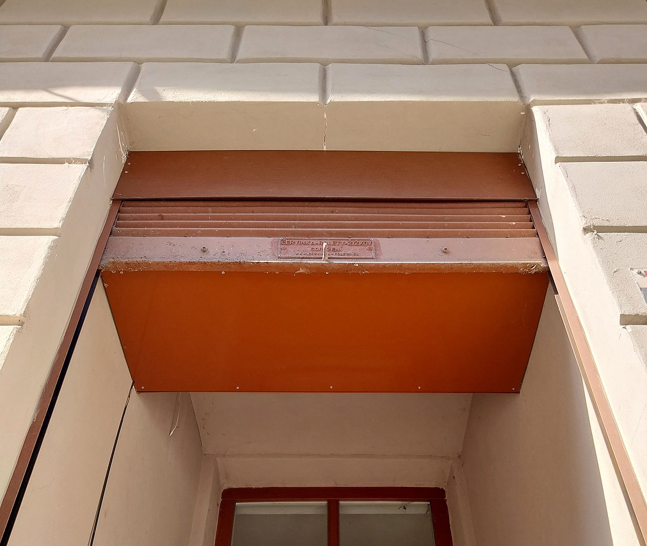 Garážová dvojroleta na Hoppově 2 v BrněJedna ze 14 původních rolet (2 + 10 + 2) na Hoppově ulici byla v roce 2024 stále v použitelném stavu.3. 12. 2024