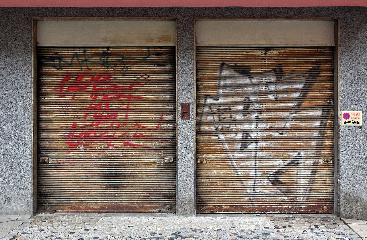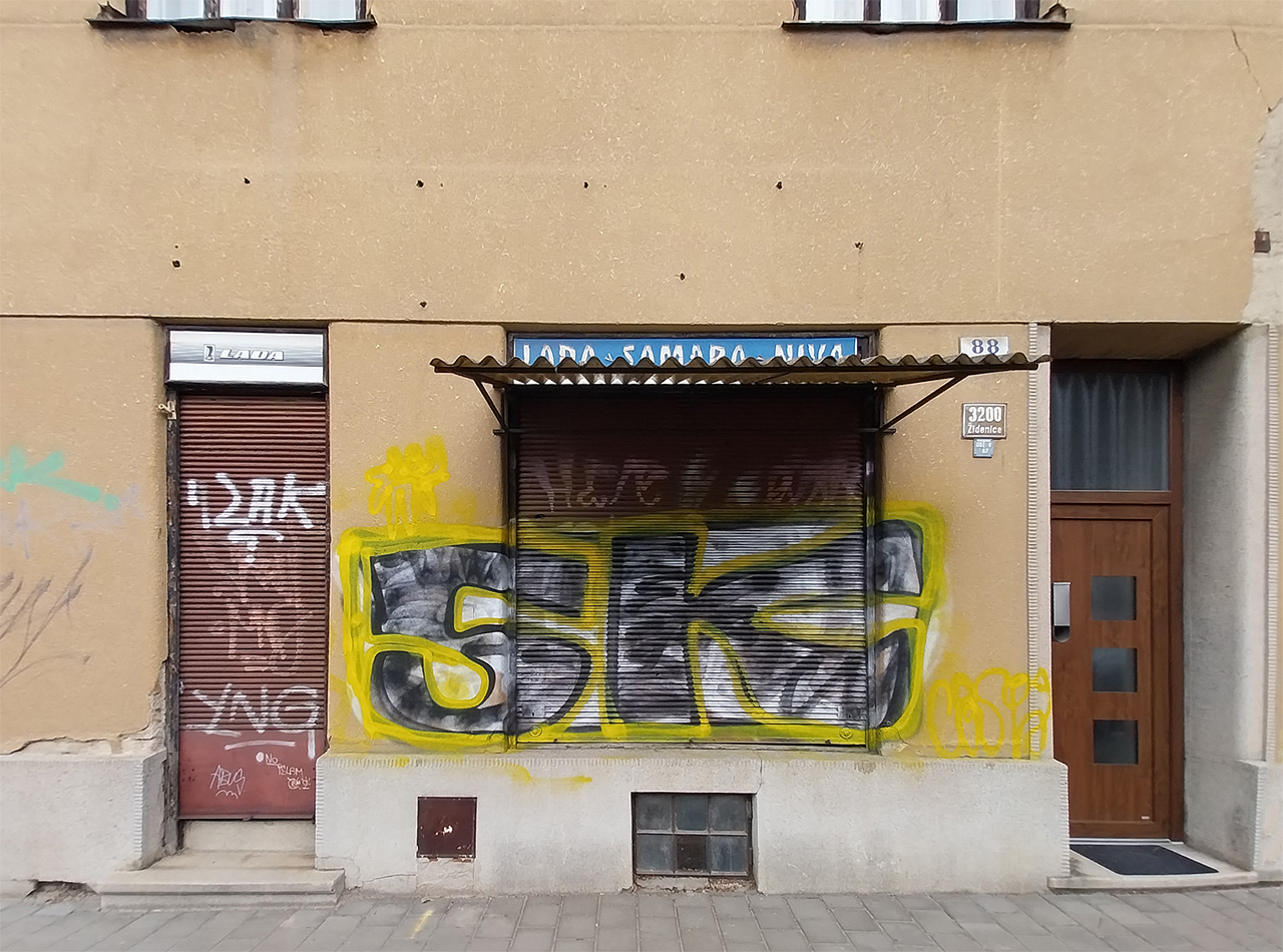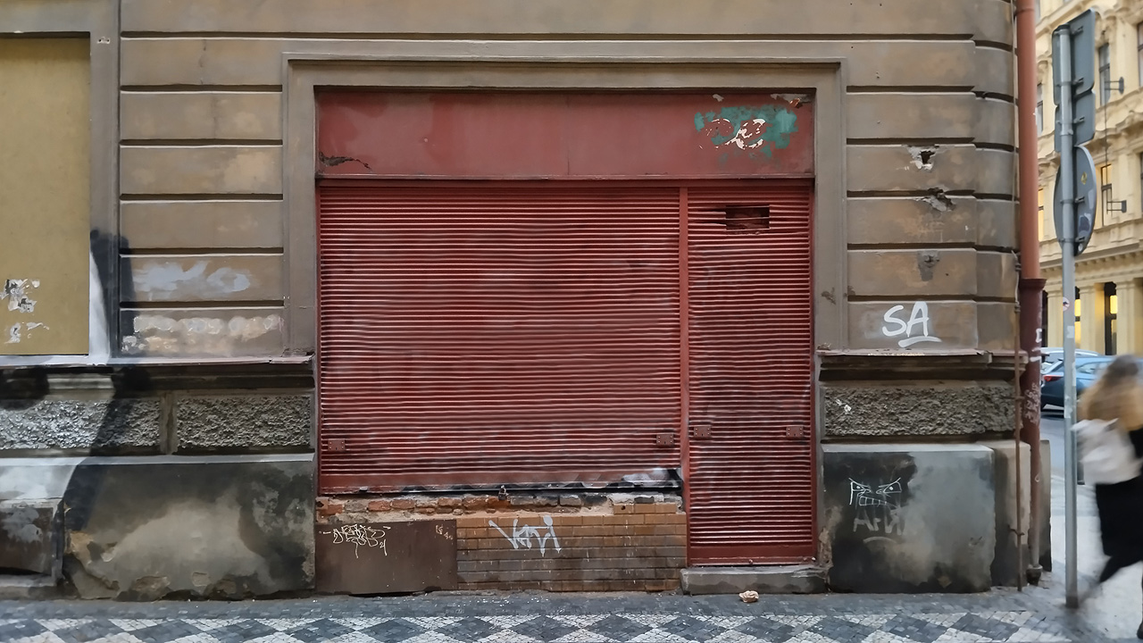 Dvojroleta na obchodě Táborská 88Roleta na okně a dveřích obchodu, který kdysi prodával náhradní díly na ruská auta značky Lada, trpí pod útoky vandalů.28. 6. 2024