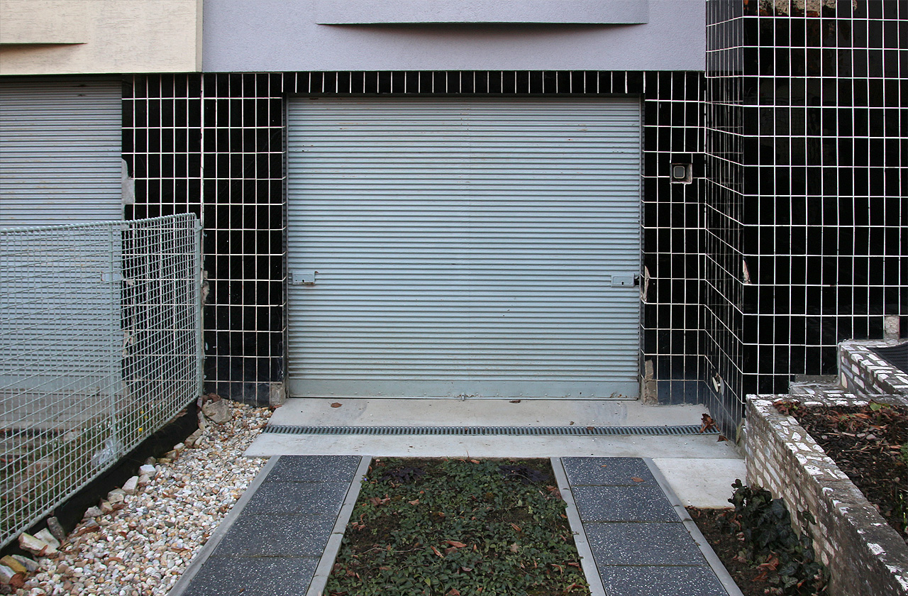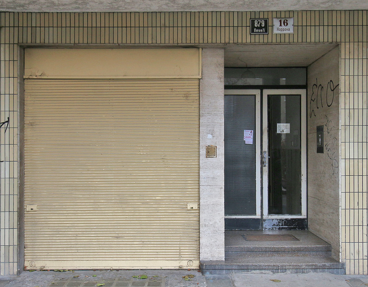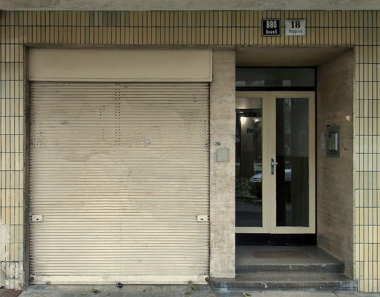 Garážová roleta na Hoppově 18 v BrněJedna z původních 14 rolet na Hoppově ulici byla v roce 2024 stále zachovalá a v použitelném stavu.12. 3. 2024
