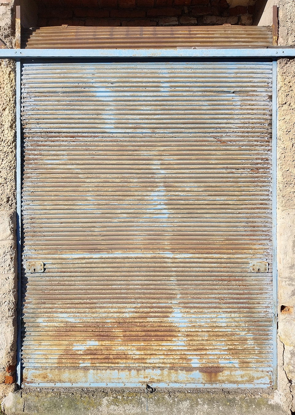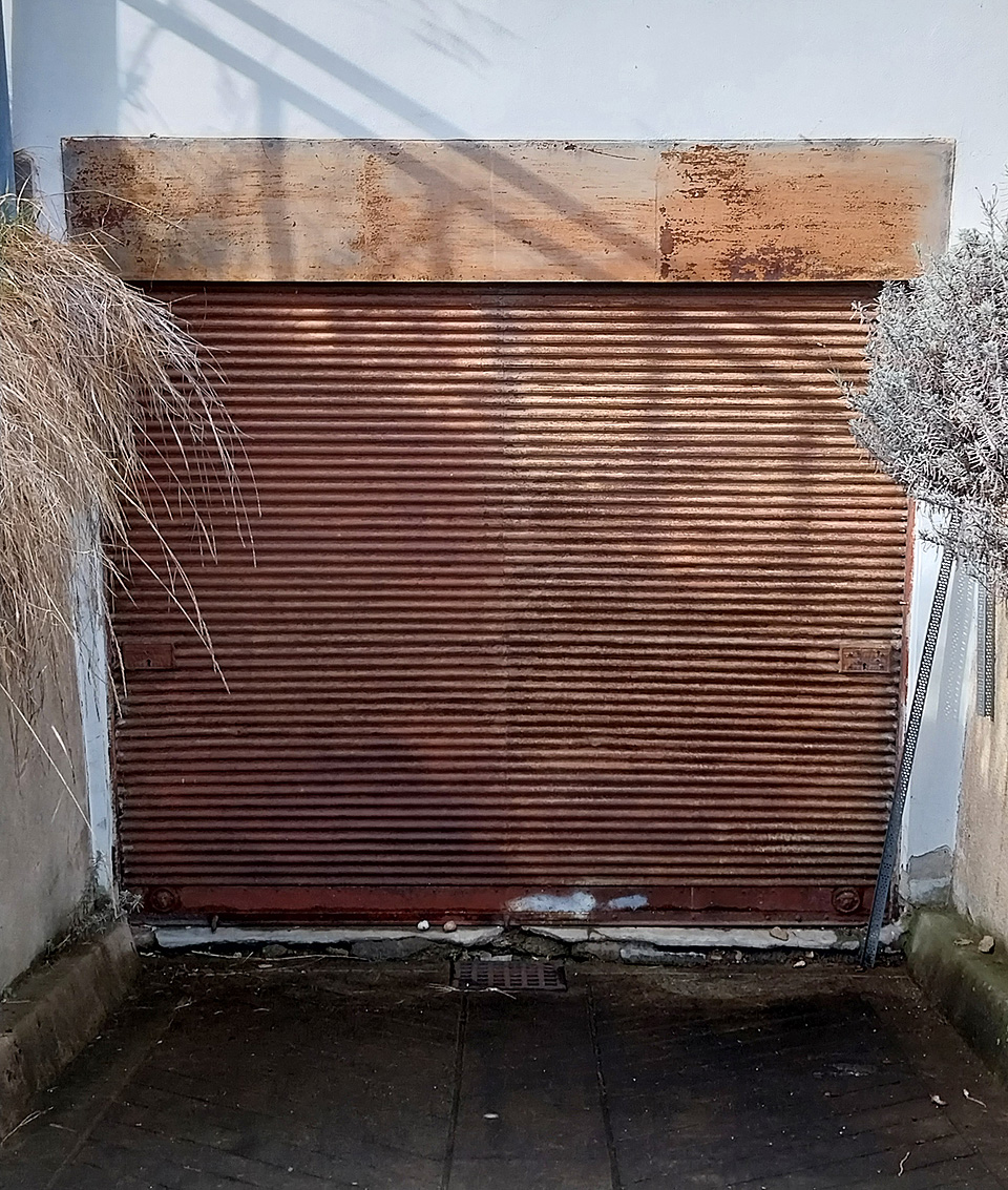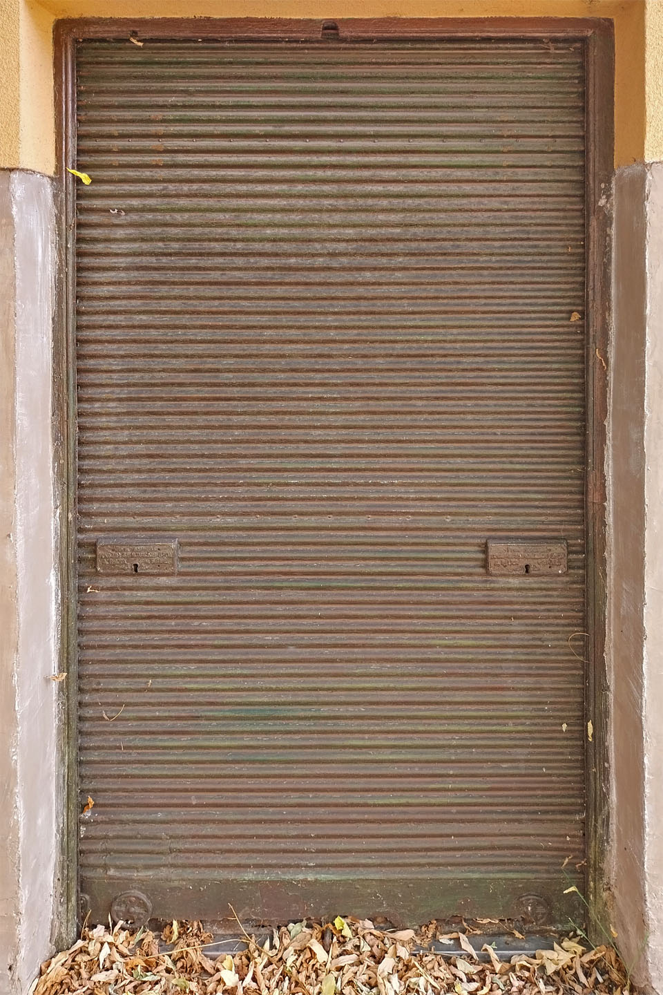 Dvě garážové rolety ve dvoře Dornych 31 v BrněDvojice zpuchřelých rolet z nichž nejméně ta rezavější byla vyrobena firmou Ergon Brno, se ukrývá ve dvoře opuštěného domu na adrese Dornych 31 v Brně. Rolety kryly garáže postavené na břehu romantického Svrateckého náhonu.28. 11. 2025