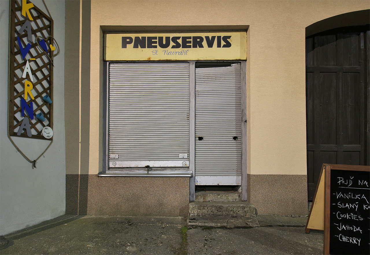 Pneuservisní roleta v NedvědiciDvojitá roleta neobvyklé stříbrné barvy kryje vchod do pneuservisu na náměstysí v Nedvědici.5. 3. 2025