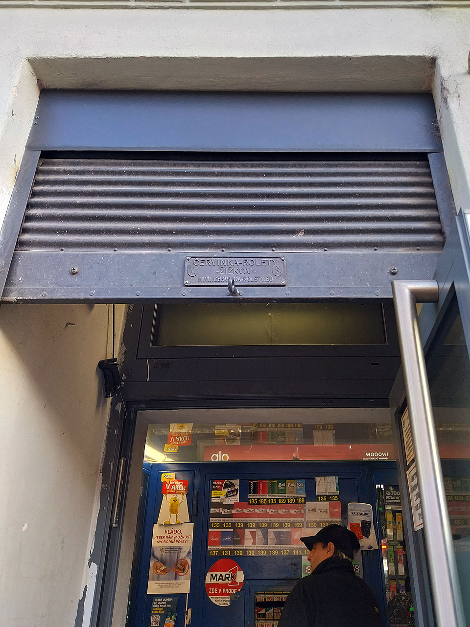 Ještě jedna roleta na Jeruzalémské ulici v PrazePravděpodobně věčně vytažená roleta se nachází na domě v Jeruzalémské ulici č. 8 v Praze, tedy ve stejném obchodu, kde svinovací rolety kryjí vstup i do malého obchůdku na rohu.28. 1. 2025