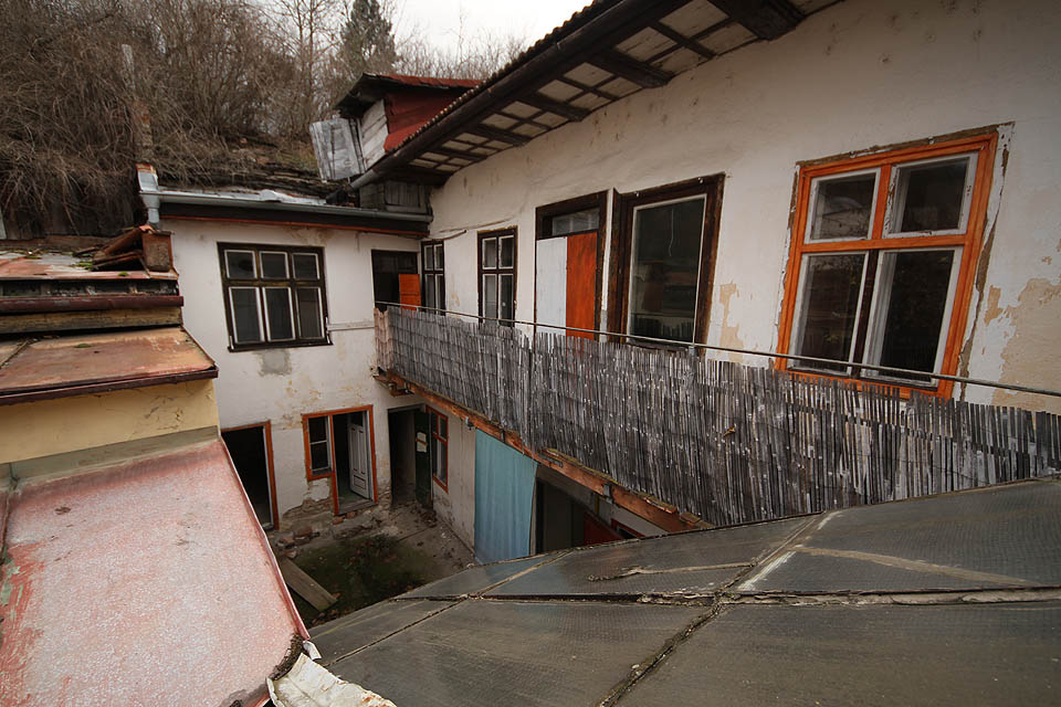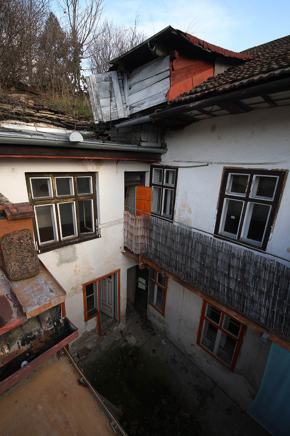 | | Při pohledu z ploché stříšky domu č. 69 vidíme postupně dvorky domů č. 67, 69 a 71. |