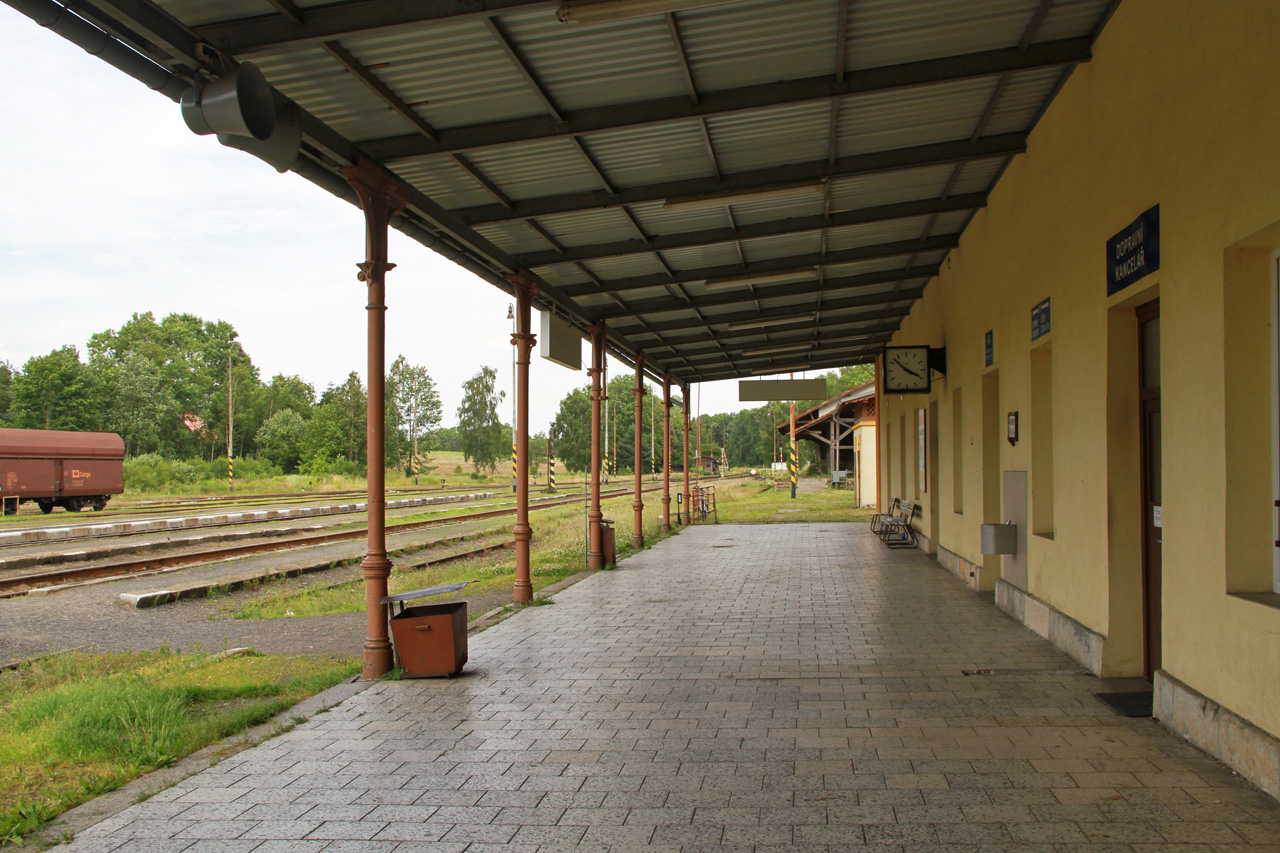 | | Pohled na nádražní budovu ze směru podél bezejmenné ulice od kulturního domu. |