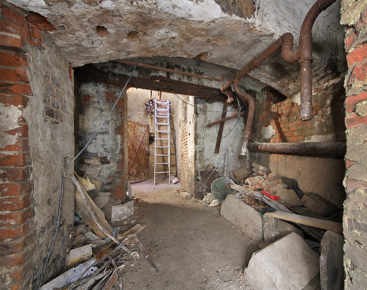 | | Část sklepů byla zaklenuta menšími klenbami mezi železnými traverzami. Místnosti byly při objevení v roce 2020 plné suti. |