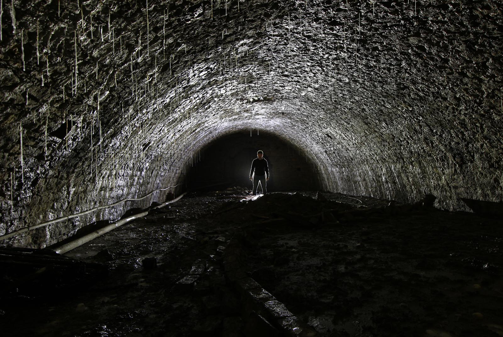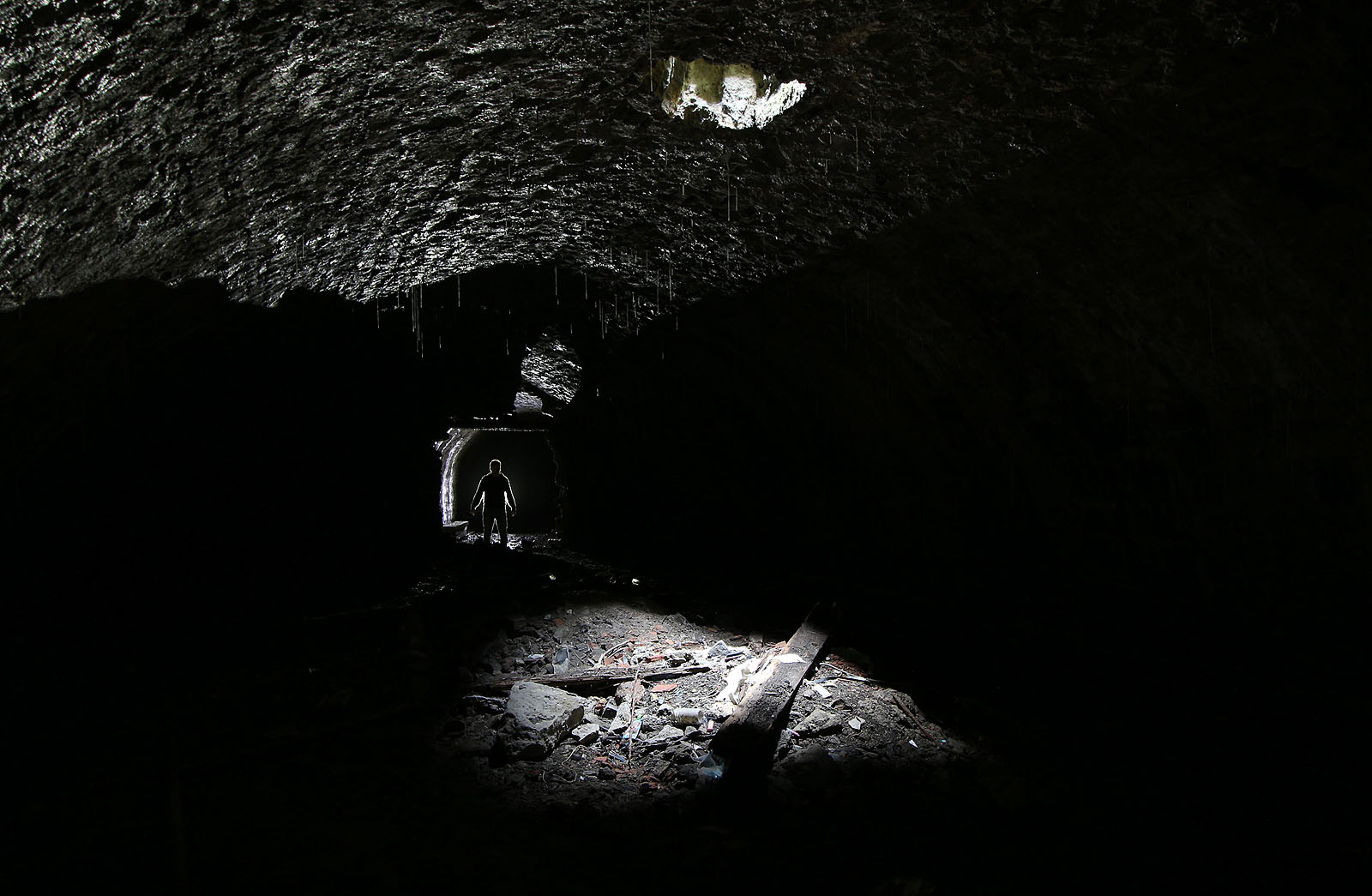 | | Tenké, běloskvoucí stalaktity vyrůstají z kamenného klenutí jako umrlčí vousy směrem ke dnu. |