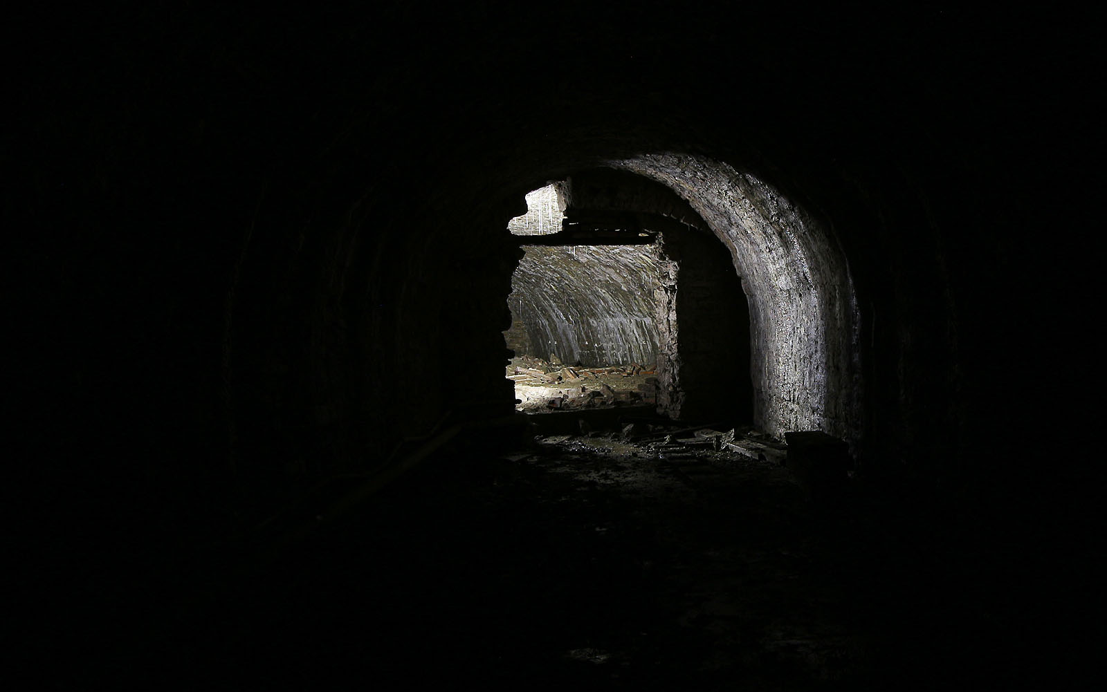 |  | | Za nenápadnou mříží se ukrývají strmě klesající schody kamsi blíže ke středu Země. |