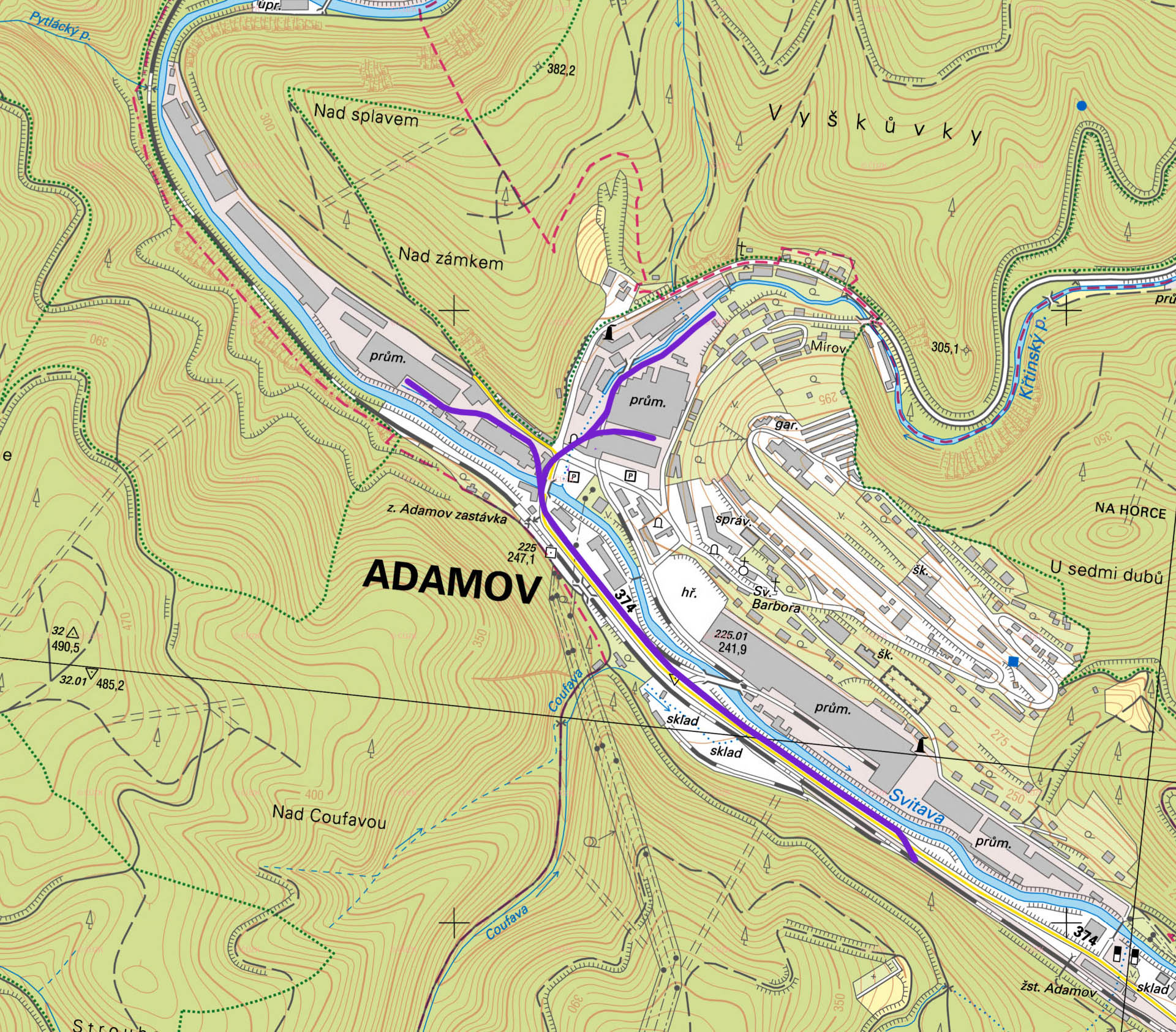 Původní trasa se pravděpodobně drobně měnila (po vývoji vlečky ztím pátrám), k nejvýznamnější změně však došlo v souvislosti s rozšířením závodu na levém břehu řeky a úpravou prostoru před budovou bývalého hotelu Skalní sklep pravděpodobně v obobí 70. nebo 80. let 20. tolatí, kdy byla kolej před divadlem na místě někdejšího dělnického domu ukončena kuse a původní most u dnešní zastávky Adamov zastávka nahradil protisměrný most posutnutý o necelého půl kilometru po proudu řeky, sloužící jednak vlakům, ale také autům a chodcům k přístupu do části závodu jižně od fotbalového hřiště. Do této části závodu tak vlaky zajížděly úvraťově a současně mohly využít trojkolejné hlavové kolejiště v blízkosti divadla a závodní jídelny pro posun a objíždění vozů. Do původních částí závodu tak bylo nutné zajíždět úvratí dvojitou.
