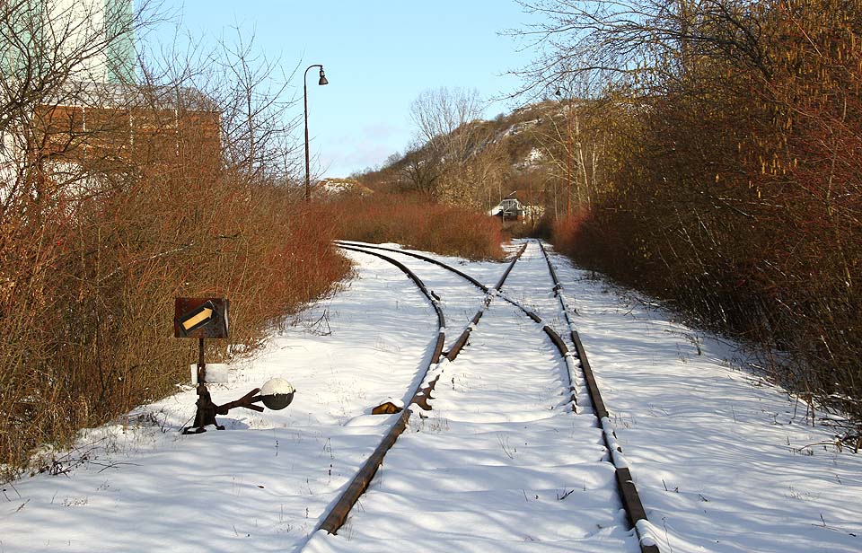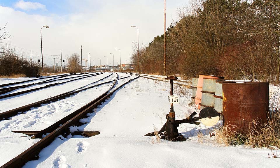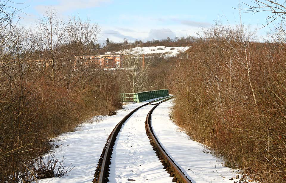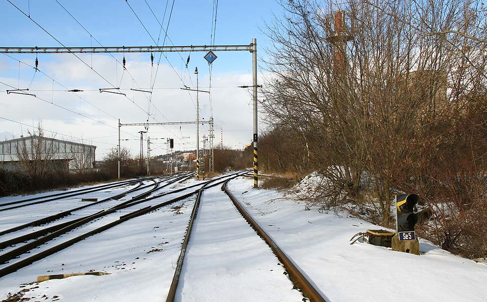 | | Za plechovými vraty vlečka pokračuje přímě ve směru k temeni Stránské skály. |