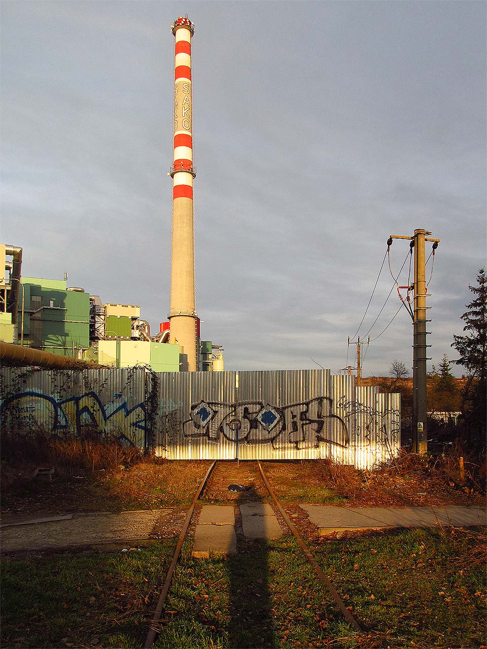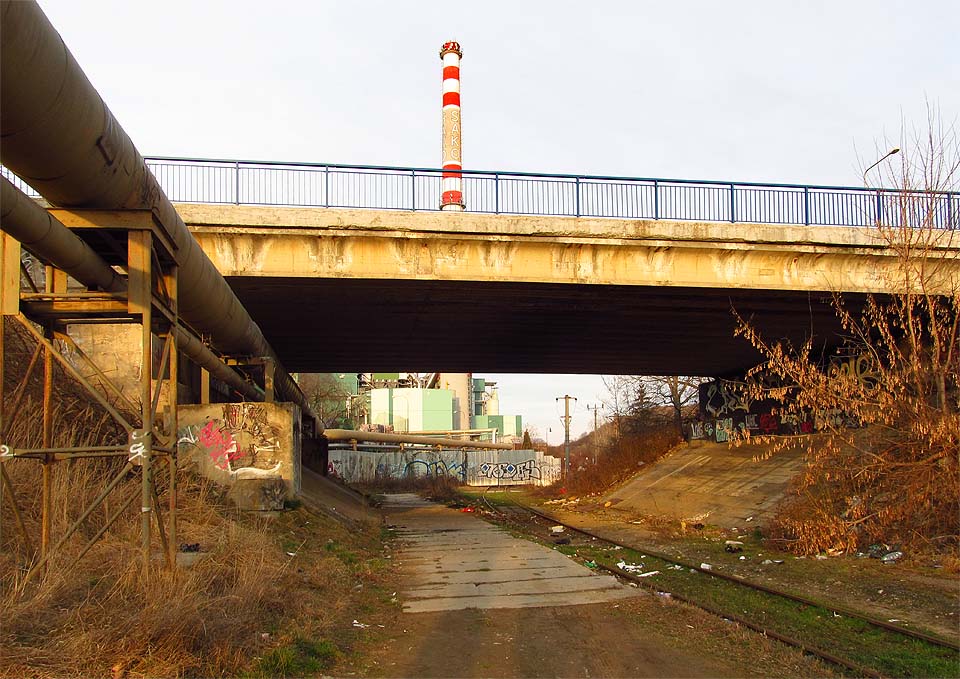| | Druhou, původní, bránu do areálu spalovny (dříve Zetoru) lemují jako slepí strážci tři nesmyslné sklonovníky. |