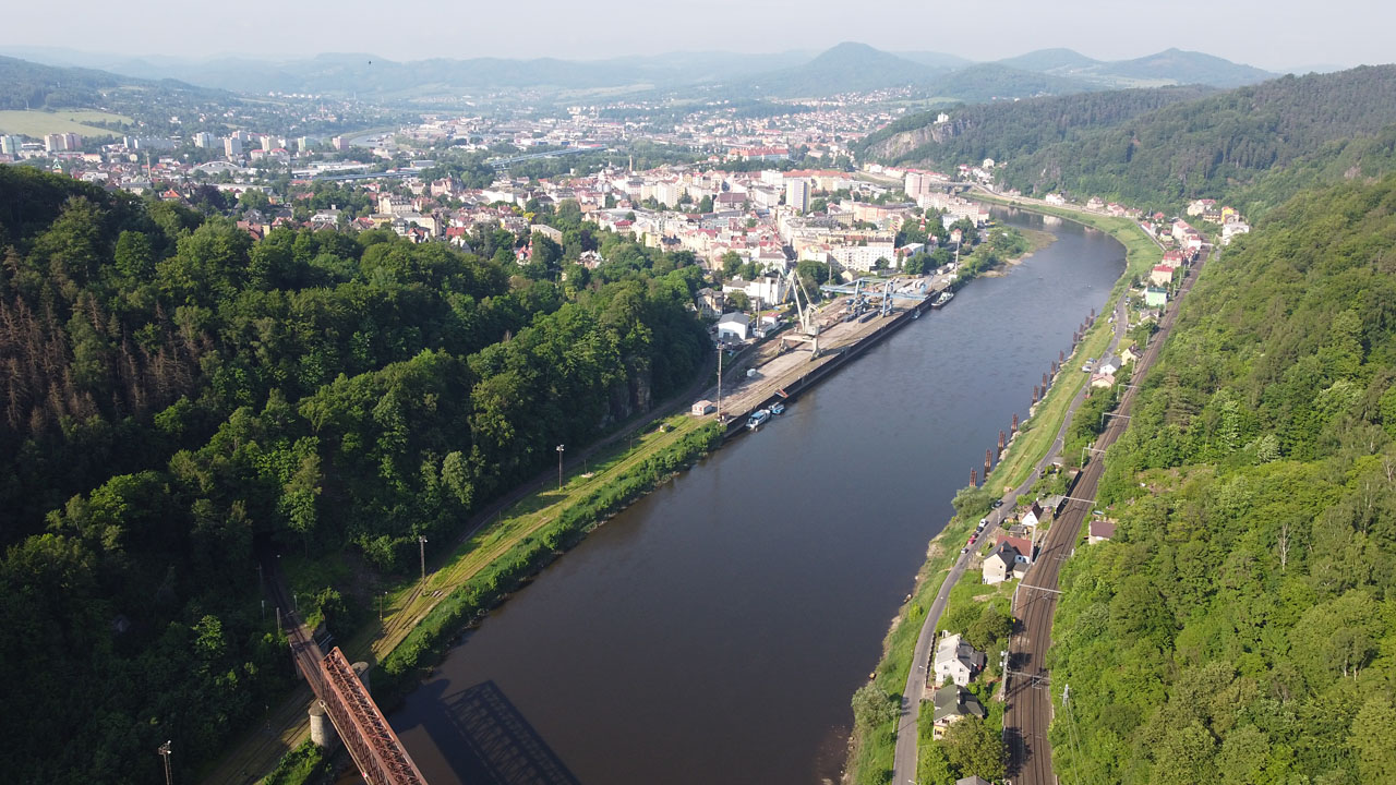 | | Na snímku z června 2021 lze v jarním oparu spatřit kromě mostu přes Labe z roku 1874 (s mostovkou z roku 1916)na pravém břehu řady stojících nákladních vozů na kolejích přístavní vlečky. Po břehu labe se koleje vlečky táhnou v délce přes 2 km. |