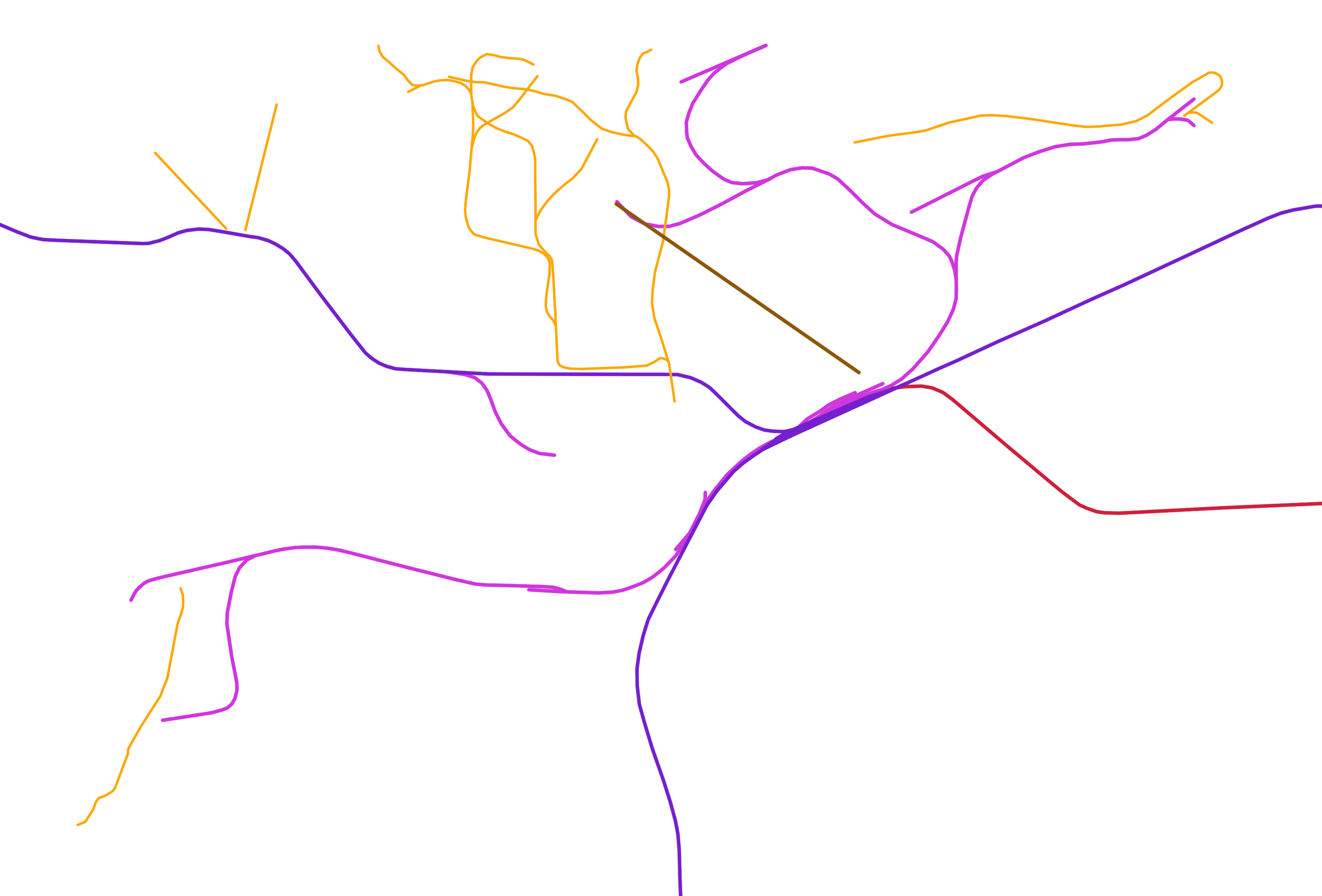 Vlečky: fialová Existující dráhy: modrá Zrušené dráhy: červená Zrušené úzkokolejky: oranžová Lanovky: hnědá